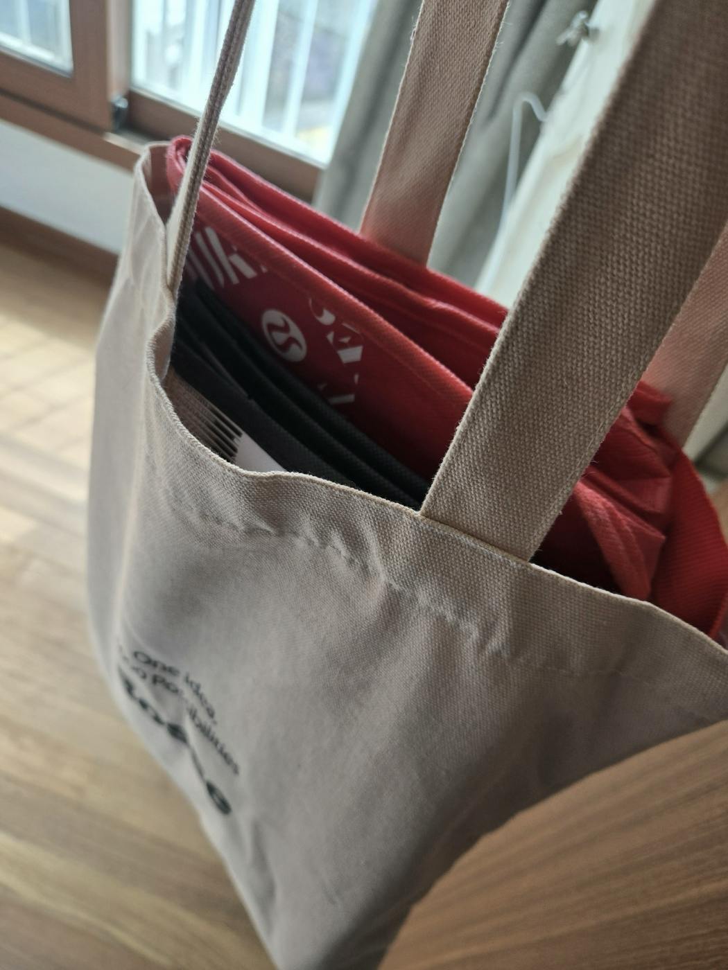 리워드가 후원자 분들께 감사의 의미로 드리는 선물이라는 의미에서 리유저블백보다 바쿠백, 그러니까 이 접이식 장바구니가 더 적합해보였다. 내구성도 더 좋을 것 같고, 이너백 뿐 아니라 신발주머니나 동네 장보러 다닐 때 쓰는 등 활용도도 더 높아보였다. 무엇보다 더이상 고민할 시간이 없었으므로 바로 제작에 돌입하기로 했다.