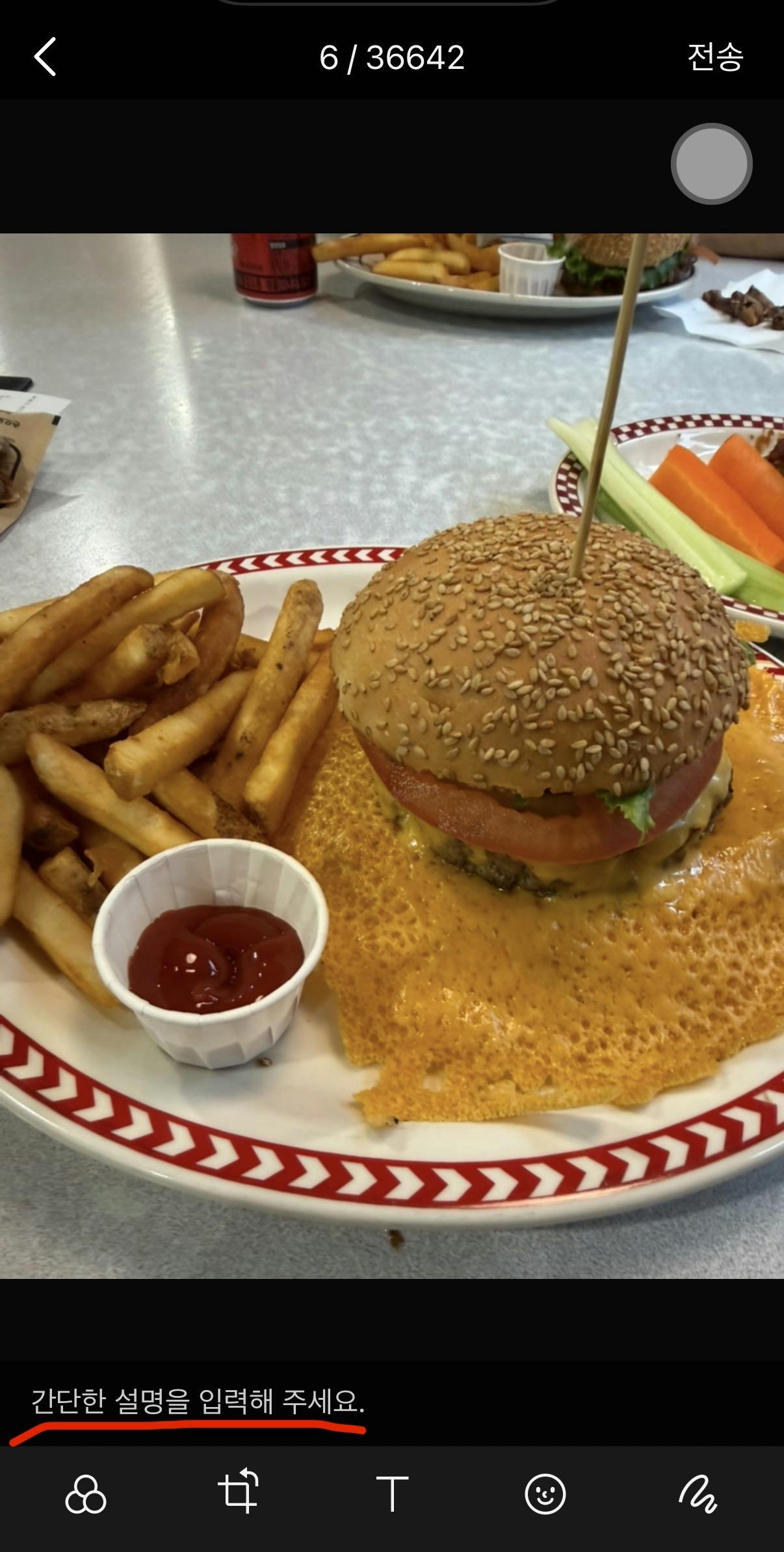 이 설명은 스크린리더 환경에서 어떻게 읽힐까요? 제가 좋아하는 햄버거 사진을 보내려고 하는데 설명을 추가했을 때와 추가하지 않았을 때 스크린리더가 어떻게 읽는지 들어보겠습니다. 영상을 재생할 때 화면을 바라보지 않고 소리로만 들어보시는 걸 추천드립니다. 먼저 설명을 추가하지 않았을 때입니다.