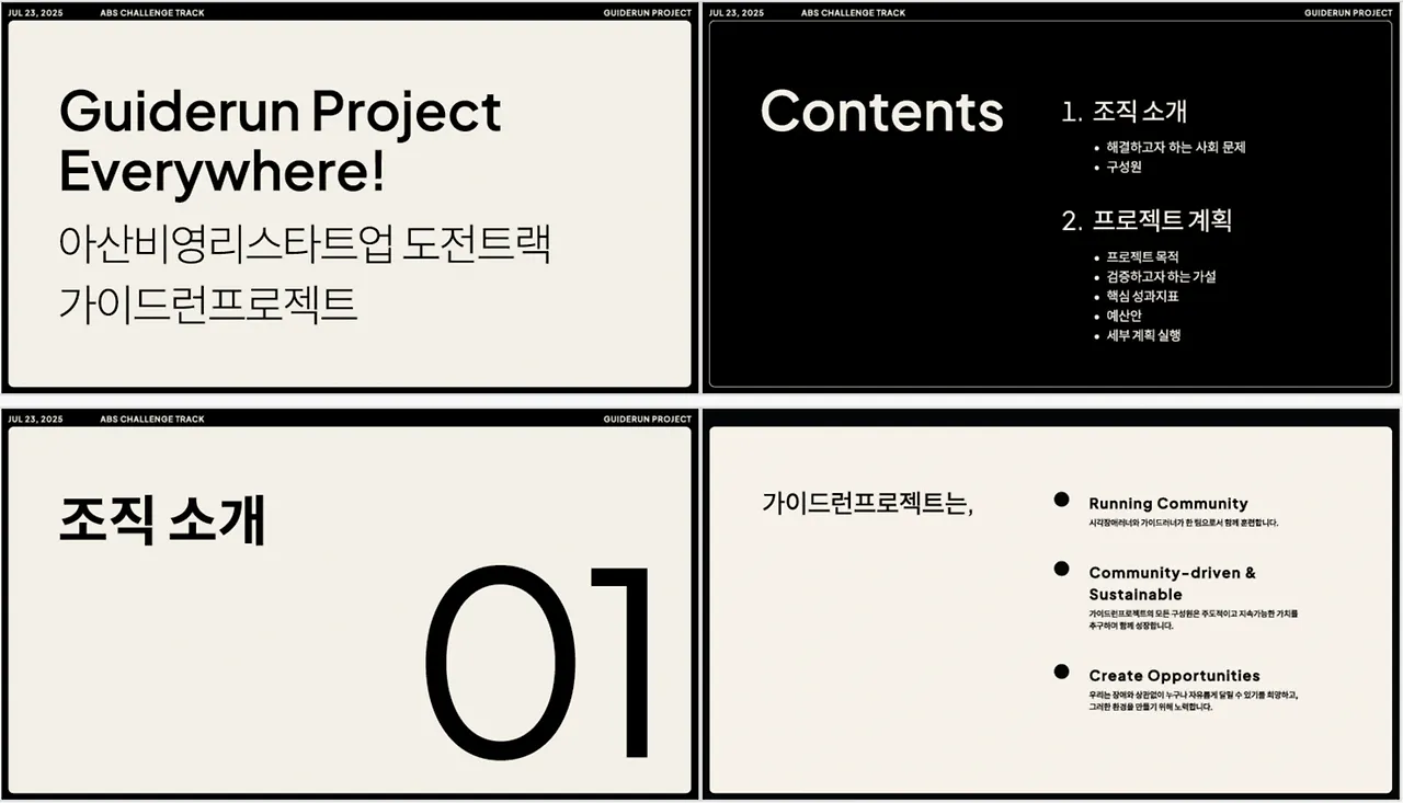 하지만 고민하고 있을 시간이 없었다. 이미 지원서에 우리 단체에 대한 설명은 충분히 했으니, 사업에 대한 설명에 대부분의 시간을 할애하기로 했다. 디자인 또한 공수를 최대한 줄이기 위해 텍스트 위주로 만들었고, 발표시간 8분 안에 모든 설명을 마칠 수 있도록 스크립트를 짜고 고치면서 계속 연습했다.