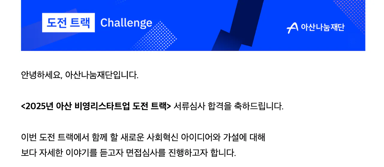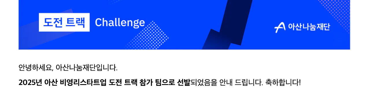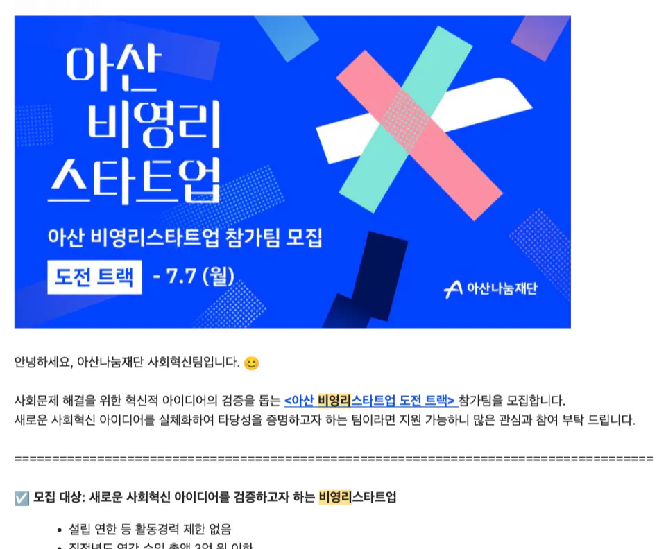 아산 비영리스타트업 도전트랙 참가팀 모집이 시작되었다는 메일이었다. 비영리 스타트업을 지원해주는 소위 '아비스'를 나는 사실 2024년 단체를 만들면서부터 알고 있었다. 하지만 그 때 나는 단체를 시작하는 시점이라 여러가지로 여력이 안되었어서 지원을 할 수가 없었다. 그렇게 아쉽게 지원 기회가 지나가는 것을 바라보며 2025년 지원사업이 열리면 꼭 지원하겠다는 다짐과 함께 2024년 지원이 마감되자마자 모집 알림 메일 신청을 해두었었는데, 드디어 모집이 시작되었다는 메일을 받은 것이었다.